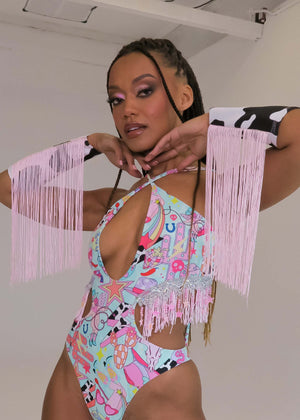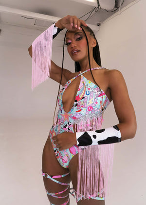 Cow Print Wrist Cuffs with Baby Pink Fringe